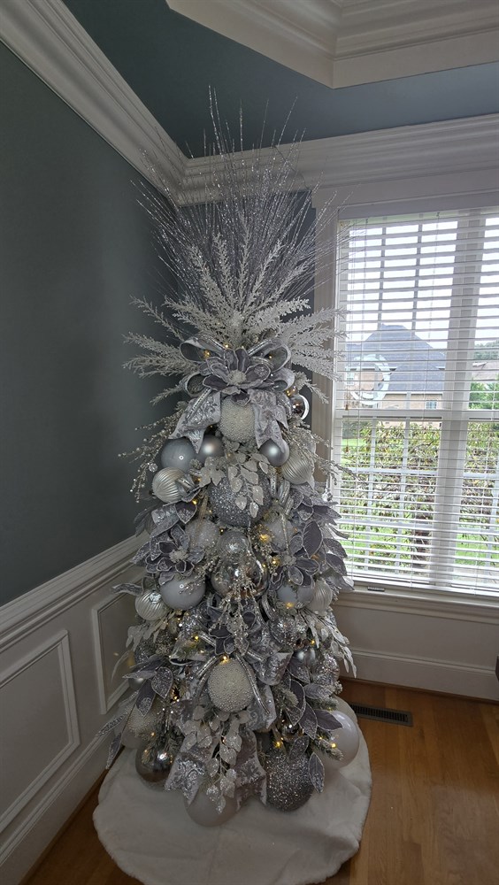 I named my dining room tree Celestial Grace. This tree was created as a testament of God's mercy and grace — wrapped in silver and white. Each pearl reflects the purity of His promises, each glass ornament a reminder of the fragility and beauty of grace. The shimmer of silver speaks of His light, guiding us through the season with hope. It's a celebration of peace, reverence, and the joy found in His presence. May every layer whisper His love and every glow invite reflection.